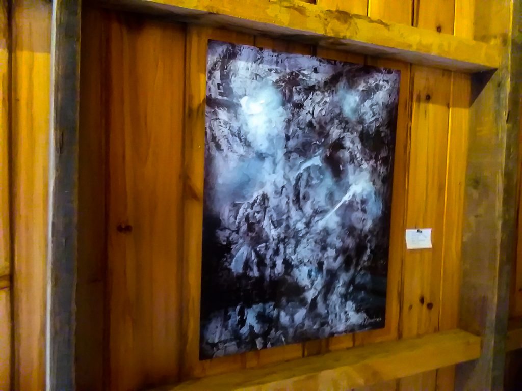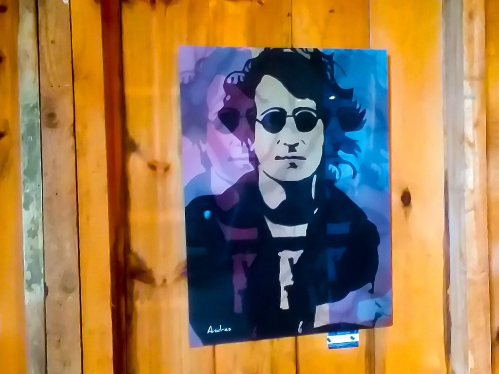 The Transparent John Lennon painting is complex. This painting is Acrylic on Canvas. It is the the same image replicated over and over again. Once, in a purple hue, once in Cyan and once monographically. It reminds me of a Warhol’s “Pop Art” piece. The wood barn adds to the perfect showroom to this talented Beatle.