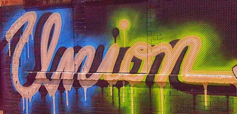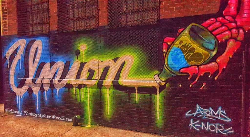A collaboration Fu did with another incredibly talented artist and designer from Brooklyn known as K-Nor can be found around Waterbury and Bogart. He tagged this piece as ATOMS (which was so exciting for me to learn because it meant going on the hunt for more of his awesome literary murals). Union is the work I think exhibits Adam FU’s signature trademark the most: wet dripping paint to the street. While it could look like an accident in some, it’s without a doubt it’s been left with intent. I enjoy reeling in the dream it’s freshly painted and my eyes are the first to take in the interpretative messages.