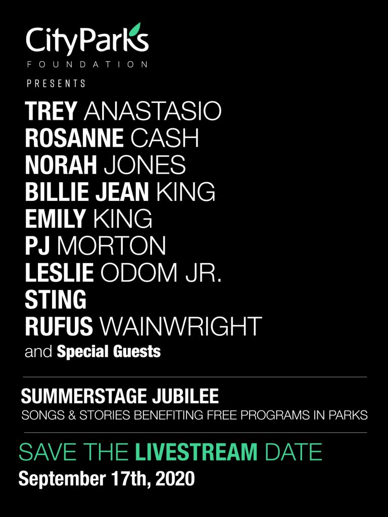 City Parks Foundation (CPF) is pleased to announce SummerStage Jubilee, a free benefit concert supporting CPF’s programs in parks, taking place across all SummerStage social platforms (SummerStage Instagram, SummerStage YouTube, Facebook page and Twitch) via live stream on Thursday, September 17 at 8:00PM EST. The digital event will feature exclusive performances by internationally renowned artists Sting, Norah Jones, Trey Anastasio, Rufus Wainwright, Leslie Odom Jr., Rosanne Cash, Emily King and PJ Morton with an appearance by sports icon and champion of equality Billie Jean King and others to be announced.
