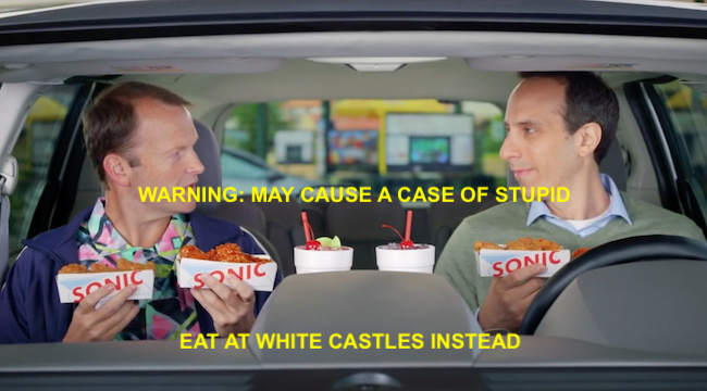 The two moron Sonic customers make me NOT want to go to Sonic. It’s like a warning sign. Caution: May cause mental retardation. Who thought this was a good campaign? Humor only works when It’s funny!