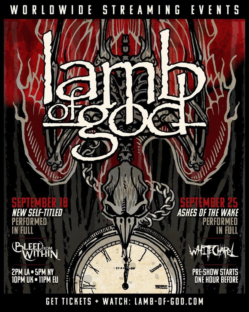 LAMB OF GOD announce two massive worldwide streaming events. Performing their brand new album and Ashes of the Wake In Full. Ticketed Livestreams Scheduled for September 18th and September 25th. Pre-show to feature band interviews and performances from WHITECHAPEL, BLEED FROM WITHIN.