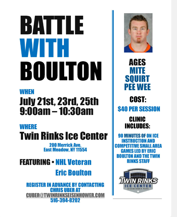 NY Islanders star Eric Boulton leads the 90-minute clinic, comprised of on-ice instruction and competitive games. For players Mites, Squirts and Pee Wees (contact Twin Rinks for clarification).