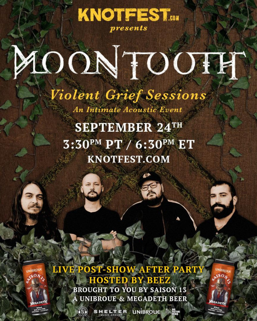 Moon Tooth have announced Violent Grief Sessions, an intimate acoustic event presented by KNOTFEST. The band will be sharing a very special performance from their recently released EP, Violent Grief: Acoustic Selections, along with a few surprises on September 24th at 6:30PM EST onĀ KNOTFEST.COM. Following the event, fans can tune into a live post-show After Party hosted by Beez, brought to you by Saison 13, a Unibroue and Megadeth Beer.