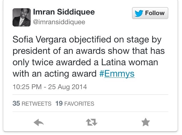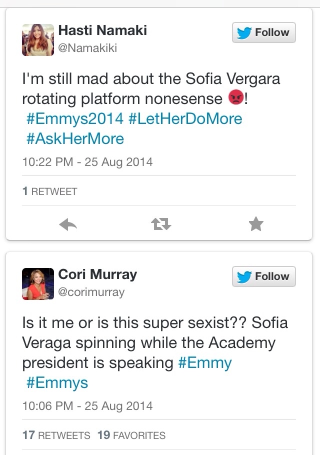 Let’s face it: Sofia Vergara might be the stunning reason you started watching Modern Family in the first place. The Colombian actress, known for her curves and hilarious role as Ed O’Neill’s PYW (Pretty Young Wife) on the show, has inadvertently managed to brew up a stir of hostility at the 66th Annual Emmy Awards. As the video shows, Vergara stood cooly in her Emmys outfit: A creamy white Roberto Cavalli gown that was, in essence, a bit sculptural. Sofia poised herself on a pedestal – literally – while Academy CEO Bruce Rosenblum gave a speech about how throughout history, the Academy of Television Arts & Sciences has continually focused on giving viewers “something compelling to watch.” .. Let the tweets begin (a very short list of what became all-out feminist Twitter rage) :
