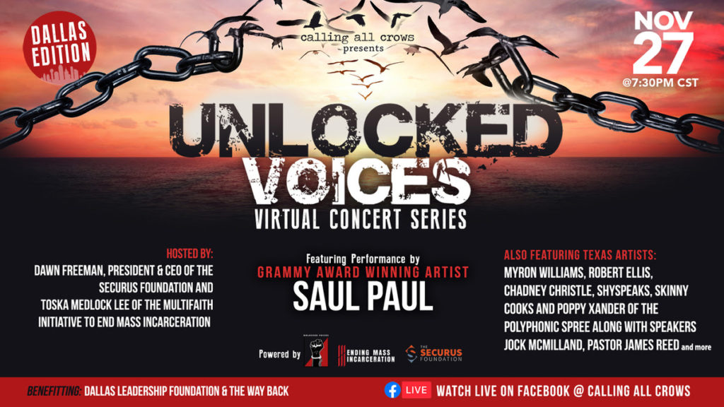 Calling All Crows, with the MultiFaith Initiative to End Mass Incarceration & The Securus Foundation, announced the third Unlocked Voices livestream fundraising event,Friday, November 27th at On The Levee in Dallas, Texas, 8pm EST.